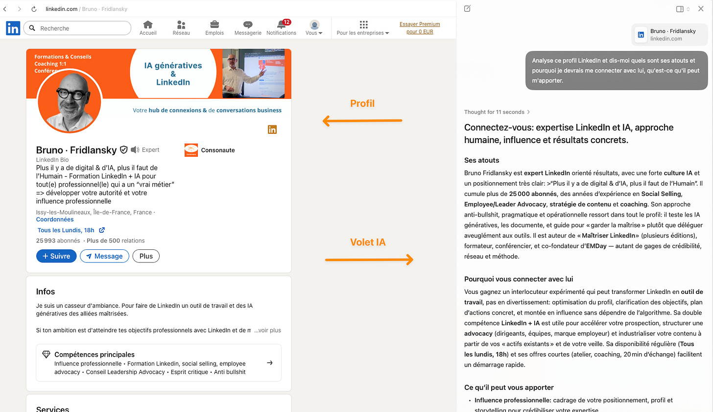 Faire cet exercice sur ton profil, c’est découvrir ce que l’IA comprend de toi. Enfin de ce que tu crois dire de toi. Et donc, quelque part ce que ton réseau est susceptible de percevoir de toi. Utilise donc le browser-IA comme un crash-test de ta marque professionnelle.