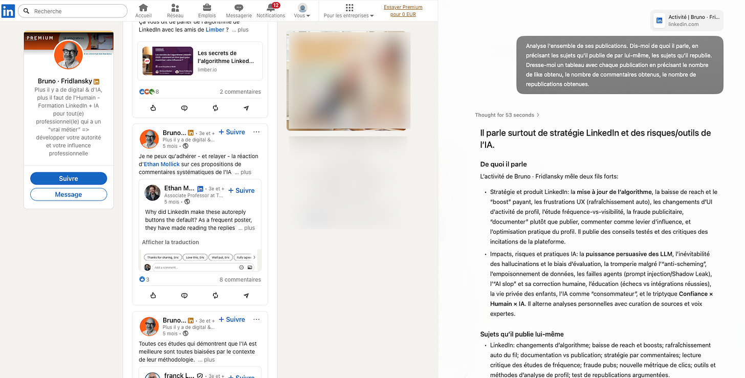 Comme pour le profil, c’est un enseignement extrêmement riche. Et sans concession. Qu’est-ce que l’IA (du navigateur) comprend de ta ligne éditoriale. Ce qui, par projection là aussi, va te donner des informations cruciales (je l’ai fait exprès) sur ce que le nouvel algorithme-IA de LinkedIn peut comprendre de toi. Et confronter tes publications avec ton profil. Est-ce que ça matche ?